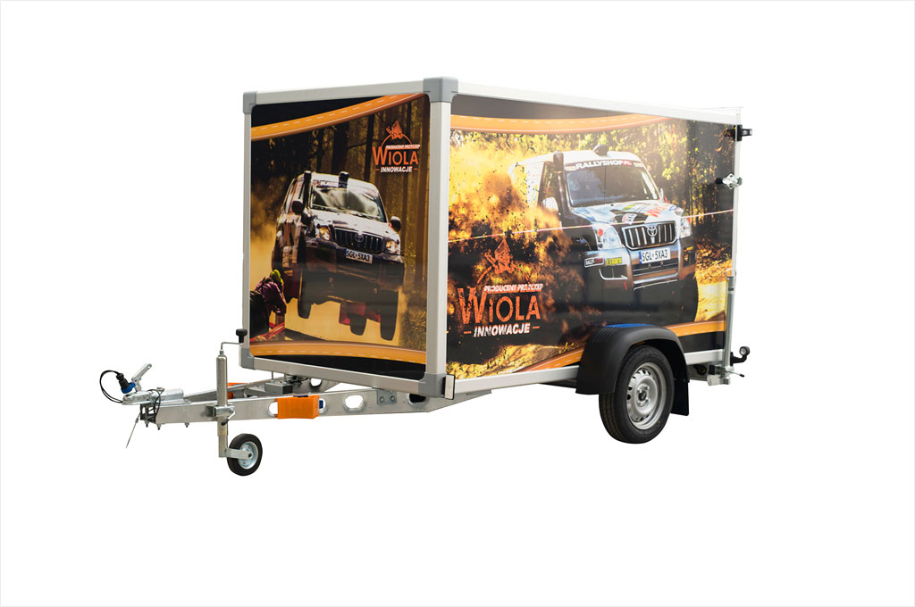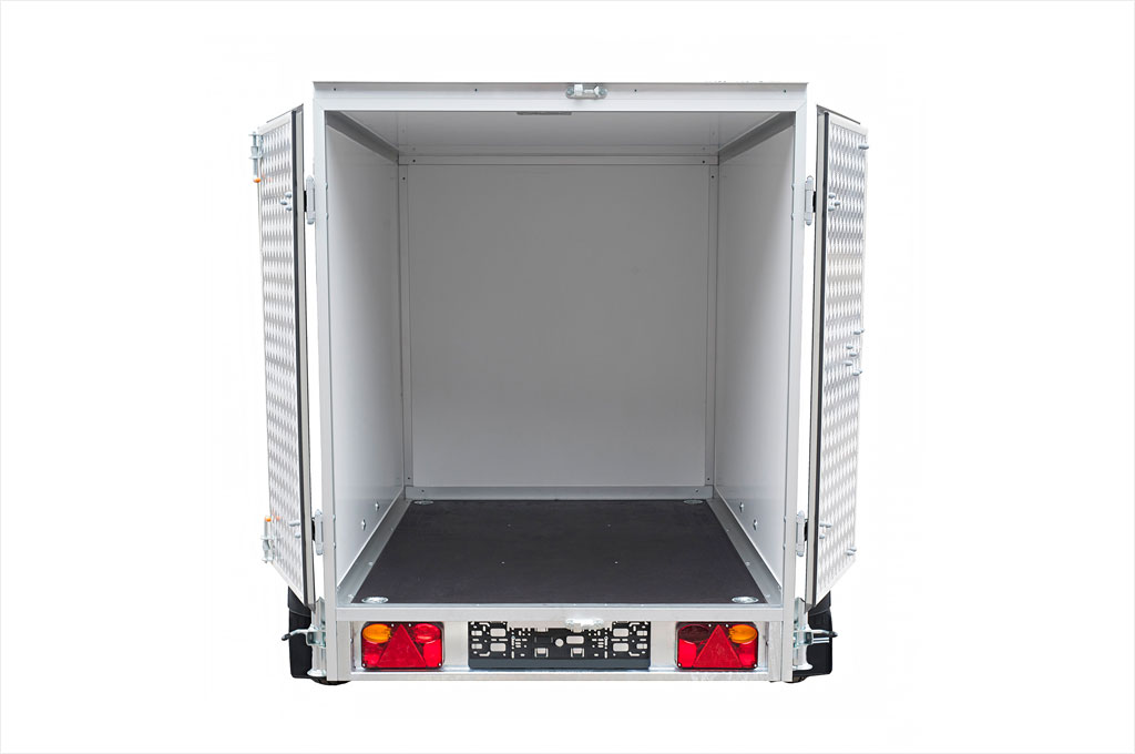 The walls of our container trailers are made of 23 mm thick „sandwich” panels- what means that it consists of two layers of polyester-glass ( or PVC) laminate with XPS foam between them. Such construction has very good thermal properties (1,35W/m2 x K), increased strenght and better aesthetic qualities. What is worth to mention, the competitive cargo trailers are made of ordinary white plywood, which is connected with steel angles and screws.